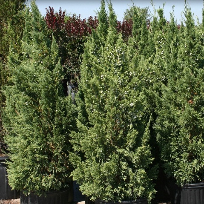 A narrow, conical, upright conifer which has grey green foliage bearing small blueish fruits which is attractive to birds.